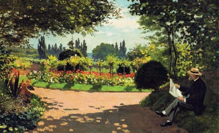 E’ del 1866, un periodo di transizione nella tecnica di Monet che lo avrebbe portato all’impressionismo e, come indica il titolo, riprende il padre del pittore intento a leggere in giardino.
